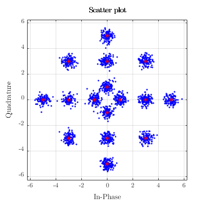 使用 genqammod 函数调制数据。由于星座图不是矩形,因此必须进行常规 QAM 调制。